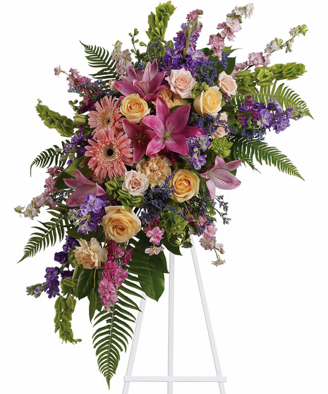 A lovely assortment of flowers such as pink roses, larkspur, asiatic lilies, gerberas and sinuata statice, with peach roses and carnations, purple stock and limonium, and bells of Ireland on a classic easel. Approximately 23" W x 30" H