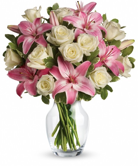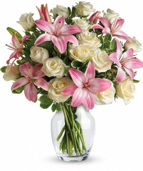 Elegant white roses and sweet pink asiatic lilies are hand-arranged with greens. It's the perfect way to show you love her always and forever. Approximately 21" W x 23 1/2" H