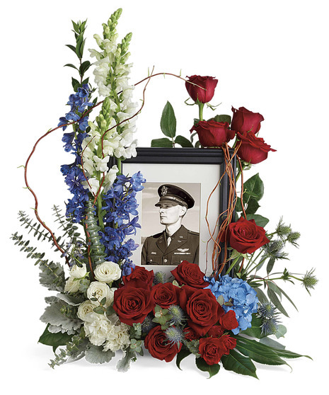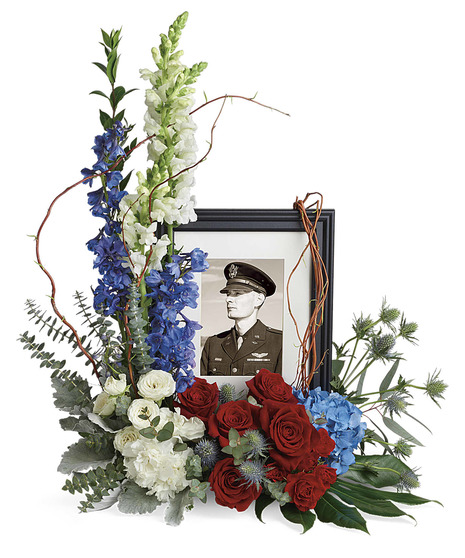 This bouquet features blue hydrangea, red roses, red spray roses, white spray roses, white carnations, blue delphinium, white snapdragons, blue eryngium, dusty miller, curly willow, spiral eucalyptus, parvifolia eucalyptus, aralia leaf and lemon leaf. Arrangement does not include picture frame.