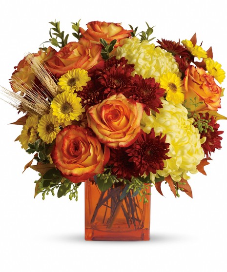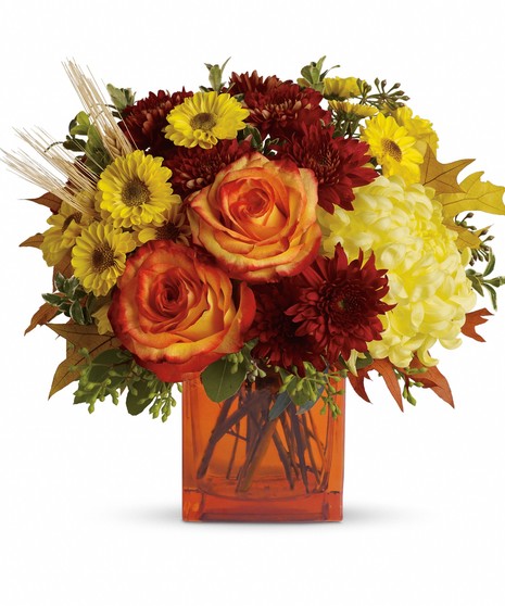 Autumn is an awesome season and it's meant to be celebrated in style. Rich fall hues are on brilliant display in this beautiful arrangement that comes delivered in a classic cube vase. The stylish contemporary arrangement includes yellow cushion spray chrysanthemums, bi-color orange roses, rust cushion spray chrysanthemums, yellow disbud chrysanthemum and yellow Viking spray chrysanthemums accented with assorted greenery. Delivered in a cube vase.