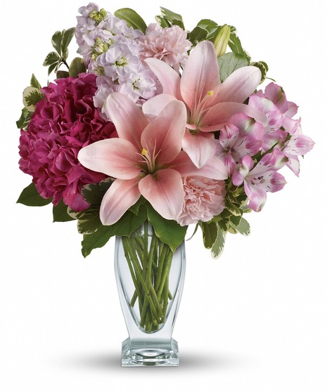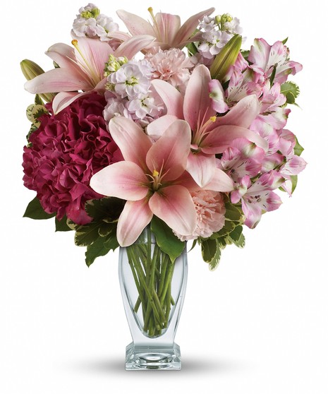 Celebrate your love with this beautifully blushing bouquet! Luxurious lilies, delicate hydrangea and fragrant stock delight her senses, soothe her soul, and tickle her fancy. It's a loving gift she won't soon forget! Approximately 14" W x 19" H