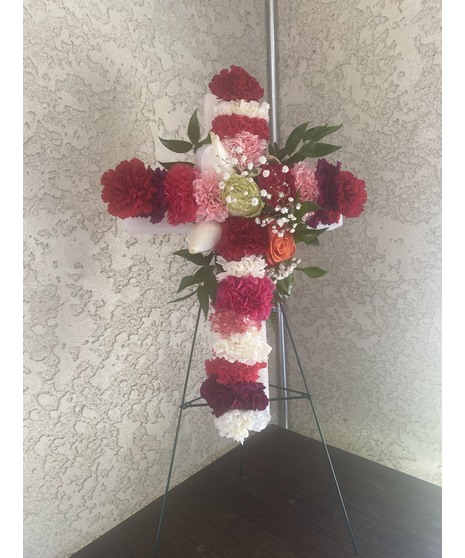 This adorable cross is perfect adornment for a loved one's gravesite. We use assorted carnations and roses to offer this lovely design at a discounted price but you can specify colors for an additional price! The cross is approximately 18" in Height and made in styrofoam. The carnations are attached with wood picks and pressed into the styrofoam. This design comes on a 2 foot stand. This item is only available for delivery to an existing gravesite to Queen of Heaven, Rose Hills, or Oakdale Cemetery OR for pick up in our store.