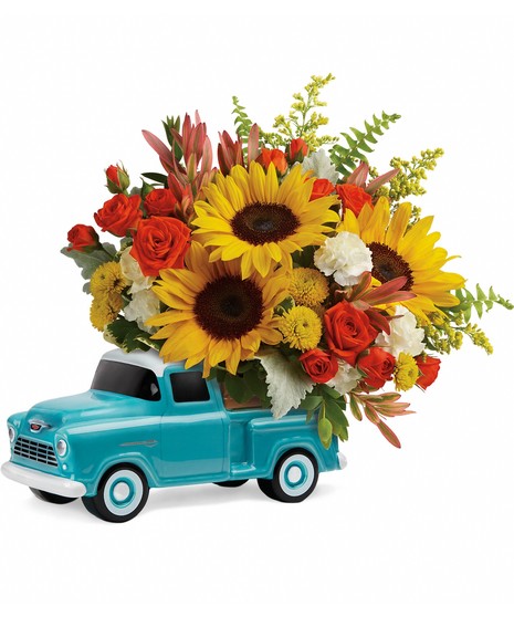 Celebrate the legacy of American craftsmanship with the Chevy Pickup Bouquet. This striking bouquet features bright sunflowers, crisp white mini-carnations, cheerful yellow button mums, and soft dusty miller, all perfectly complemented by the bold red hues of leucadendron and the golden accents of solidago. The deluxe and premium upgraded versions also feature orange spray roses/ Designed in a hand-painted, hand-glazed Chevy Pickup container that commemorates the 100th anniversary of Chevy Trucks! This bouquet is more than just a floral arrangement—it's a tribute to enduring strength and timeless style. Perfect for car enthusiasts or anyone who appreciates a touch of nostalgia, the Chevy Pickup Bouquet adds a classic touch to any space.