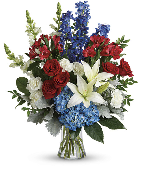 This bouquet features blue hydrangea, red roses, white asiatic lilies, red alstroemeria, white carnations, blue delphinium, white snapdragons, huckleberry, dusty miller, aralia leaf and lemon leaf. Delivered in a gathering vase.