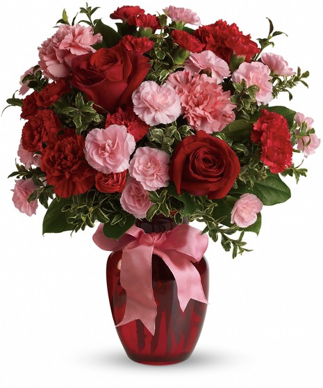 A mix of carnations and roses in shades of red and light pink. Delivered in a glass vase accented with pink satin ribbon. Approximately 14" W x 16 1/2" H