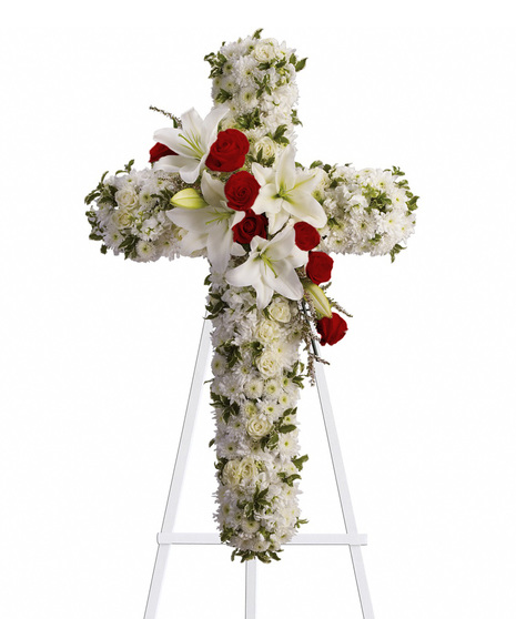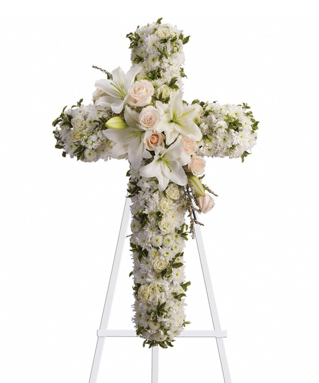 Sympathy cross of creme roses, lilies, stock and more presented on an easel.