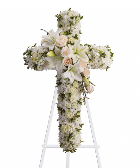 Honor the memory of a loved one with our Divine Light Cross, a beautiful and elegant tribute that symbolizes peace and eternal love. This exquisite cross features a stunning arrangement of creamy roses, delicate white spray roses, and elegant white Oriental lilies, creating a serene and graceful display. Accented with cushion and button chrysanthemums, and lush pittosporum, the Divine Light Cross is a heartfelt expression of sympathy and reverence. This floral tribute offers comfort and solace during a time of loss, reflecting the cherished memories and the enduring spirit of the departed.