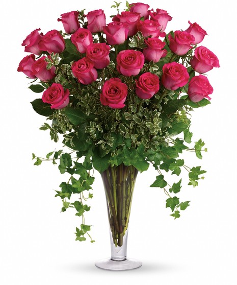 Think of the thanks you'll get when a vase full of vibrant hot pink and red roses, hand-arranged with ivy and other garden greens is delivered. Your dreams might come true, too. Approximately 24" W x 32" H