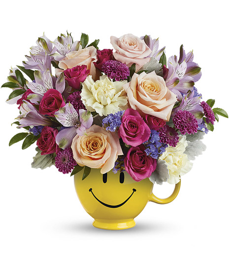 Delivered in a cheerful yellow happy face mug, "Embrace Happiness" is more than just a floral display—it's a burst of sunshine and smiles. Whether you're sending well wishes, celebrating a special occasion, or simply brightening someone's day, this arrangement is a heartfelt way to share happiness and affection. Let the lively hues and charming presentation uplift spirits and spread joy to your loved ones.