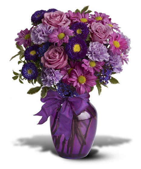 NOTE: Due to the unique nature of each flower's availability some substitutions may be necessary. In case the purple vase is not available, a clear vase will be used.