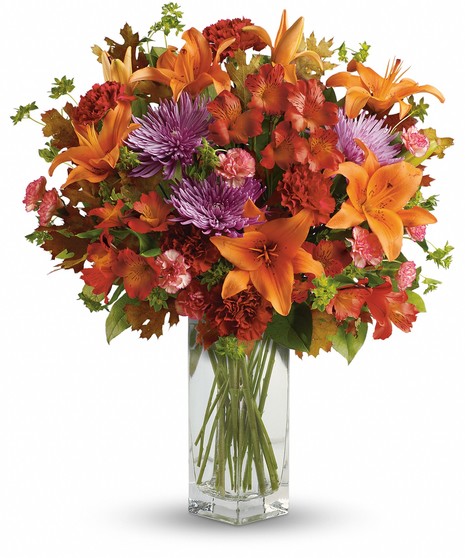 Brighten any fall day with this colorful array! Gorgeous orange lilies arranged with red and lavender blooms are sure to make someone smile! This lovely bouquet includes orange asiatic lilies, dark orange alstroemeria, red carnations, orange miniature carnations, lavender disbud chrysanthemums, bupleurum, lemon leaf and oak leaves. Delivered in a beautiful clear Bunch vase.