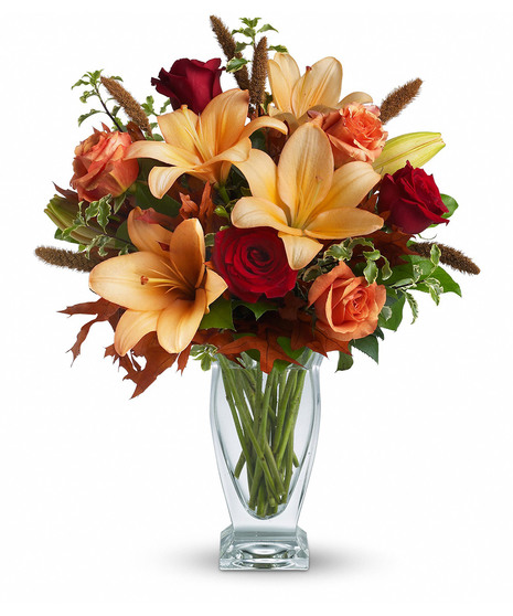 Absolutely exquisite! This bouquet is a fall flower fantasy come true. All the richness of this colorful season is captured in a stylish glass vase. So pretty, you might have to order one for a friend and one for yourself! Beautiful orange and red roses, yellow asiatic lilies, autumn oak leaves and more are beautifully arranged in an exclusive Couture Vase. Isn't fall fantastic?