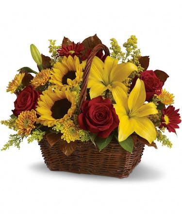 Here's a golden opportunity to make someone's day. Just send this delightful basket of fresh fall flowers to someone who's on your mind and you can be sure it will lift their spirits! Sunny sunflowers and asiatic lilies, gold and burgundy chrysanthemums, solidaster, brown copper beech and salal are splendidly arranged in a wicker basket. Send it and you'll be golden, too.