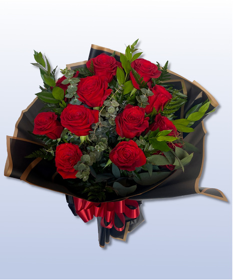 Introducing our exquisite Scarlet Symphony Bouquet, a classic expression of love and romance. This stunning bouquet features twelve radiant red roses, symbolizing deep passion and heartfelt affection. To enhance the visual appeal, the bouquet is expertly crafted with lush myrtle, elegant spiral eucalyptus, and delicate seeded eucalyptus, adding texture and dimension to the arrangement.