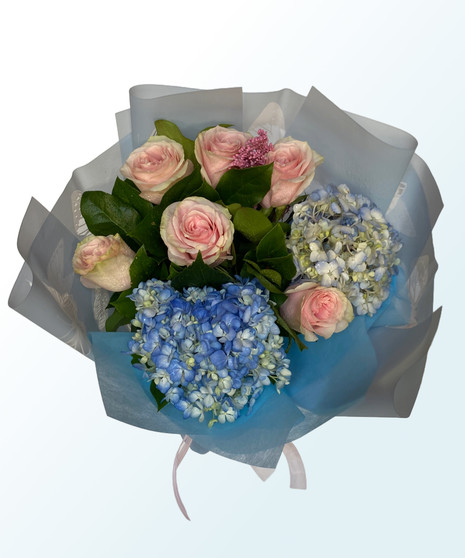 The combination of hydrangea's calming presence and the tender beauty of roses creates a bouquet that speaks volumes of tranquility and affection. Whether as a gift to convey heartfelt sentiments or to enhance a special occasion, the "Tranquil Blue and Blush Bouquet" offers a soothing touch of nature's beauty. With every petal carefully arranged and secured in a hand-tied style, this bouquet is a true work of art.