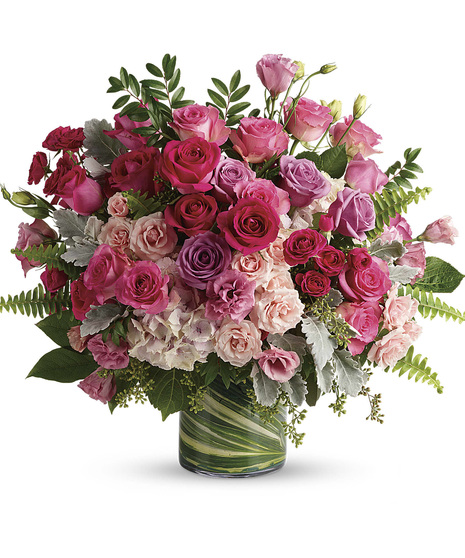 This gorgeous bouquet includes light pink hydrangea, hot pink roses, lavender roses, pink roses, hot pink spray roses, light pink spray roses, pink lisianthus, dusty miller, huckleberry, sword fern, seeded eucalyptus, lemon leaf, and variegated aspidistra leaves. Delivered in a large glass cylinder vase. This design is one-sided.
