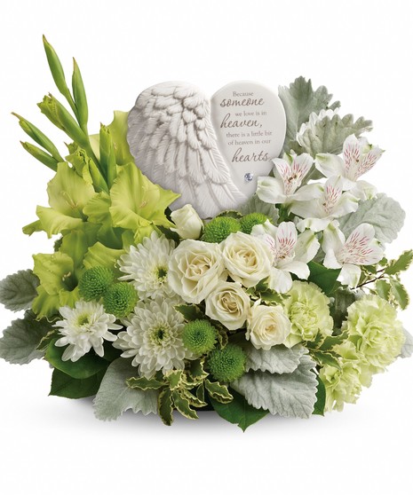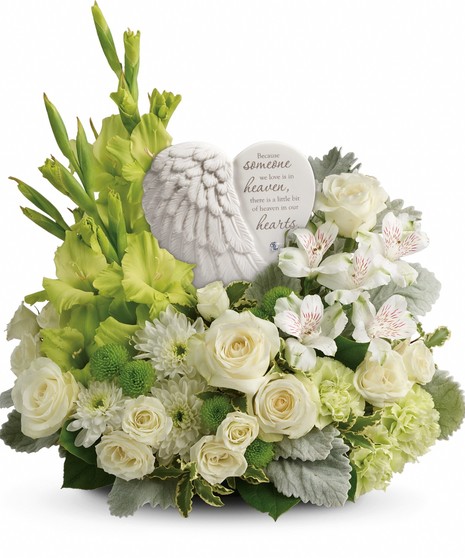 White spray roses, white alstroemeria, green gladioli, green carnations, green button spray chrysanthemums, and white cushion spray chrysanthemums are accented with dusty miller, pitta negra, and lemon leaf. Delivered with a Heaven's Heart keepsake.