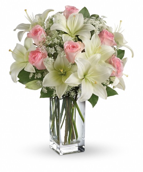 Light pink roses, white asiatic lilies, Queen Anne's lace and salal are beautifully arranged in a glass vase. Heaven sent? Well, someone will think you're an angel for sending it!
