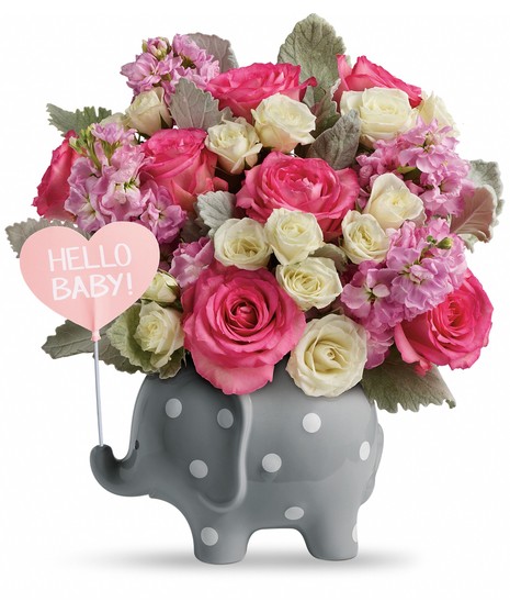 This adorable gift features pink roses, white spray roses, pink stock, and dusty miller. Delivered in a Hello Baby Elephant.