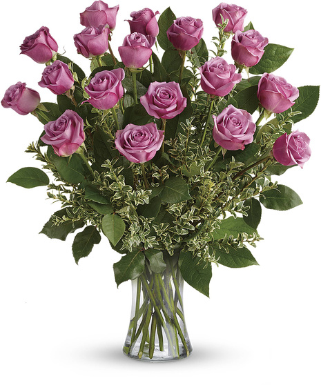 A gorgeous greeting for any occasion, this lovely lavender bouquet features up to two dozen radiant roses with lush greens in a classic glass vase.