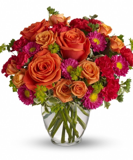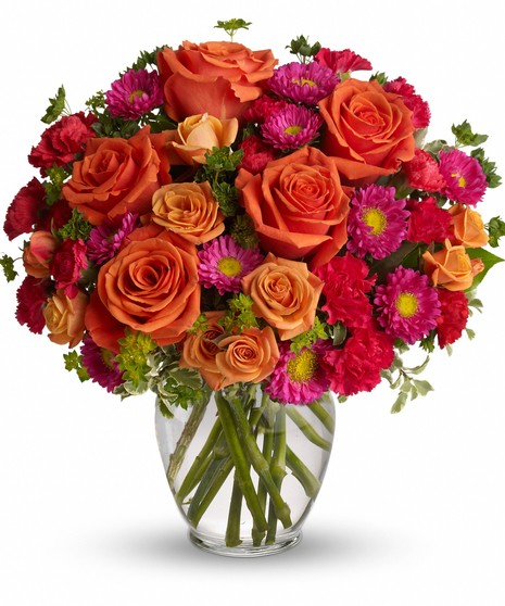 Orange roses and spray roses, asters, hot pink mini carnations and more in a clear glass vase.