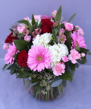 This stunning floral arrangement features a vibrant blend of red roses, pink gerbera daisies, pink mini carnations, pink alstroemeria, white hydrangea, and lush seeded eucalyptus. The bouquet is artfully arranged in a clear bubble bowl, creating a modern and chic look. The red roses add a touch of passion and romance, while the pink gerbera daisies and mini carnations bring a playful and lively feel to the arrangement. The pink alstroemeria and white hydrangea add a touch of elegance and grace. The seeded eucalyptus adds an earthy and natural touch to the bouquet. The bubble bowl design makes this bouquet perfect for any room in your home or as a gift to a loved one. This bouquet is perfect for any occasion, be it a birthday, anniversary or any other special occasion. The premium version has pink stargazer lilies to add a touch of elegance.