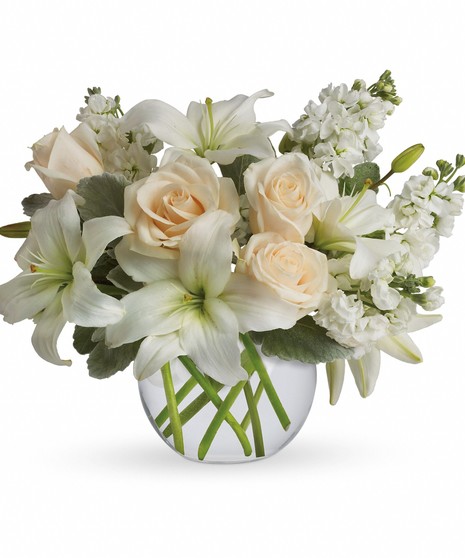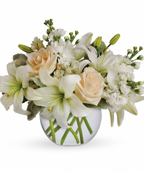 Crème roses, white asiatic lilies and stock stem are incredibly arranged in a bubble vase. When it comes to bouquets, this is definitely the right way to do white. Approximately 14" W x 11 1/2" H