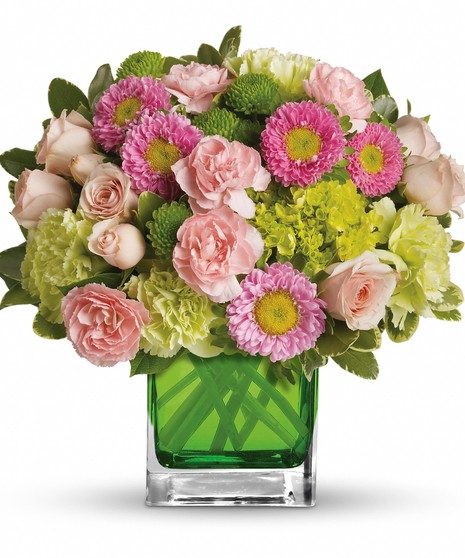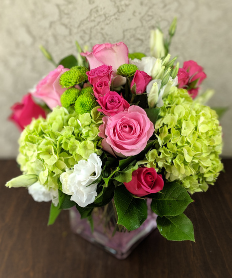 This vibrant bouquet is popping with beautiful fuchsia, pink, and green flowers! Lovingly designed featuring green hydrangeas, fuchsia spray roses, pink roses, green button mums, and white lisianthus this gift makes a design for a desk or end table! Comes designed in a pink glass cube vase. Approximately 13"H x 13"W.
