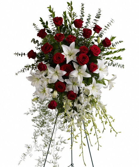 Celebrate the beauty and grace of a loved one with our Lily and Rose Tribute Spray, a stunning arrangement that embodies love and elegance. This exquisite standing spray features vibrant red roses, symbolizing deep affection and respect, alongside pristine white Oriental lilies, which represent purity and devotion. Delicate white dendrobium orchids add an exotic touch, enhancing the arrangement's sophistication. Accented with lush springheri and a variety of greenery, this spray creates a harmonious blend of colors and textures. The Lily and Rose Tribute Spray serves as a heartfelt expression of sympathy, honoring the memory of your loved one with beauty and dignity during this difficult time.