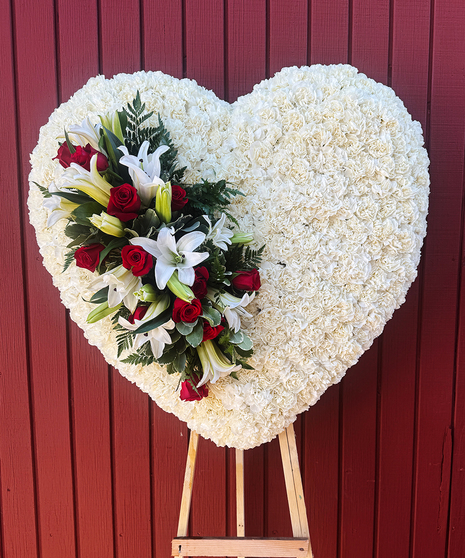 A stunning funeral heart made up of all white carnations and accented with a beautiful cluster of red roses and white stargazer lilies. Designed and included with an easel this Funeral Heart design is great choice for a funeral of a loved one.