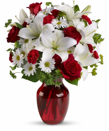 Red roses and carnations are exquisitely arranged with white asiatic lilies and chrysanthemums in a ruby red glass vase. It's absolutely lovely. Approximately 15" W x 18" H