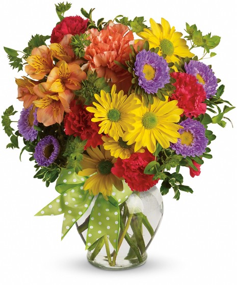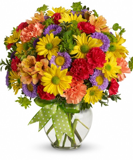 Yellow, red, purple and orange mixed flowers in a clear glass vase with a green polka dot ribbon.