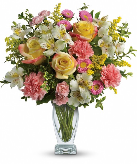 Yellow roses, pink carnations, white alstroemeria and pink asters are accented with solidago and oregonia. Delivered in a glass vase. Approximately 18" W x 21 1/2" H Vase may vary.