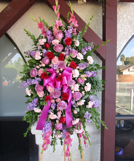 The Passionate Affection Spray is a stunning and emotive funeral arrangement featuring a beautiful blend of red and lavender roses, soft pink carnations, soft pink spray roses, pink gladiolus, and lavender stock, elegantly arranged on an easel. This vibrant spray conveys deep love and affection, symbolizing the rich emotions felt during times of remembrance. Its striking colors and thoughtful composition create a powerful tribute that honors the life and spirit of a loved one, providing comfort and solace to all who gather to pay their respects.