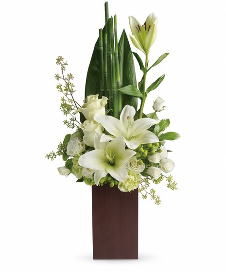 Includes white roses, asiatic lilies, green carnations and green button chrysanthemums, accented with a variety of fresh greens. Delivered in a Tall Bamboo vase. Approximately 13" W x 24 1/2" H