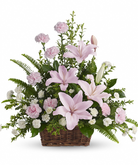 The Peaceful White Lilies Basket is a serene and elegant funeral arrangement featuring stunning white stargazer lilies, white carnations, and white mini carnations, all delivered in a large, graceful basket. This beautiful bouquet symbolizes purity, peace, and remembrance, offering a comforting presence during times of sorrow. The harmonious blend of blooms creates a soothing and tranquil atmosphere, making it a perfect tribute to honor and celebrate the life of a loved one while providing solace to those in mourning.