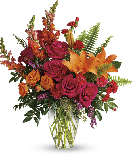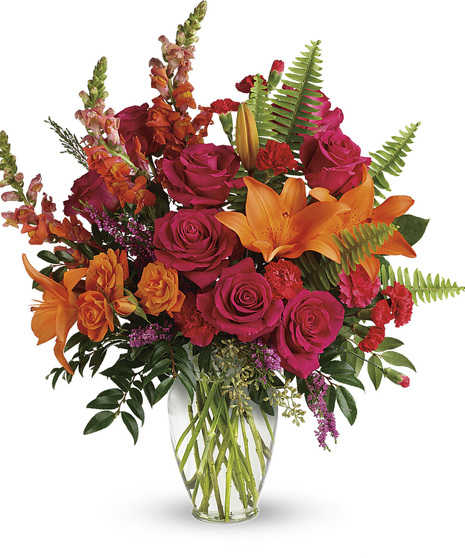 Hot pink roses, orange spray roses, orange asiatic lilies, hot pink carnations, red miniature carnations, orange snapdragons, and pink heather are accented with sword fern, huckleberry, seeded eucalyptus, and lemon leaf. Delivered in a clear glass vase.