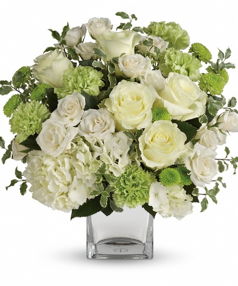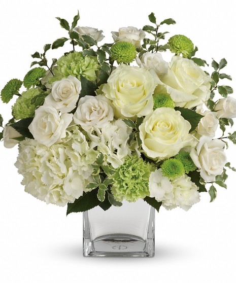 This bouquet of blooms includes white hydrangea, white roses, white spray roses, green carnations, green button spray chrysanthemums and pitta negra. Delivered in a silver mirrored cube vase.