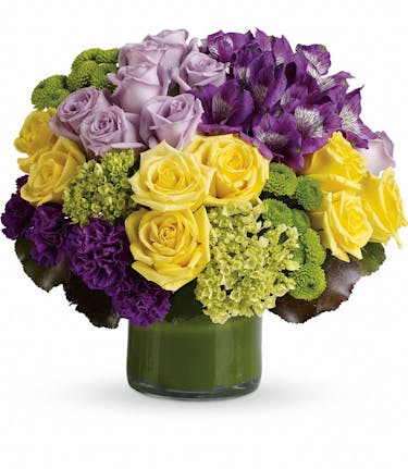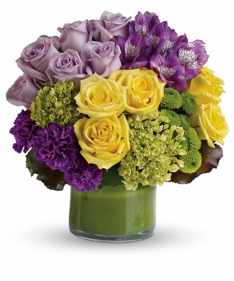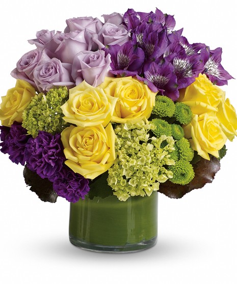 Make a floral fashion statement! Hand-delivered in a leaf-wrapped cylinder vase, this stylish bouquet is a sophisticated mix of roses, hydrangea and alstroemeria that's outstanding for any occasion. This chic arrangement includes miniature green hydrangea, lavender and yellow roses, purple alstroemeria, dark purple carnations, green button spray chrysanthemums, galax leaves and a ti leaf. Delivered in a clear glass vase.