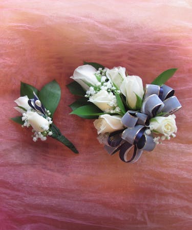 A lovely corsage and boutonniere set featuring Spray Roses orchids and a sheer ribbon. Set includes both.