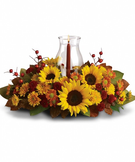 Along with brilliant sunflowers, you'll find yellow spray roses, bronze and rust chrysanthemums, red berries, magnolia leaves and of course an elegant tapered candle inside a hurricane vase. Approximately 22" W x 13" H
