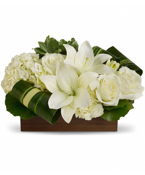 Lovely and serene as a Zen garden, this exquisite bouquet of white roses, lilies and hydrangea in a natural bamboo vase is a gift of love that will be long remembered. Send it to someone very special.