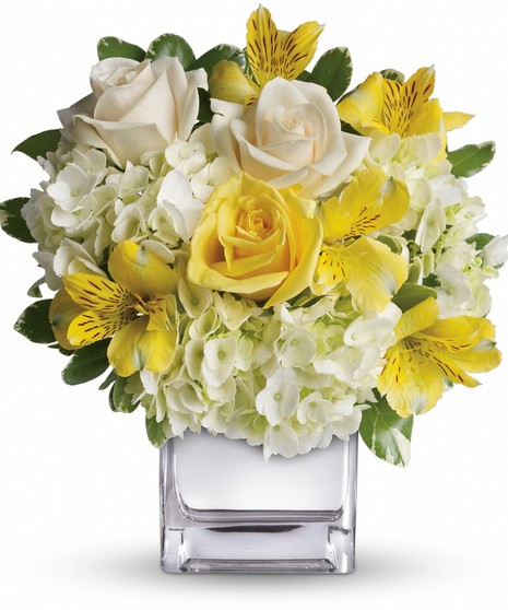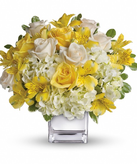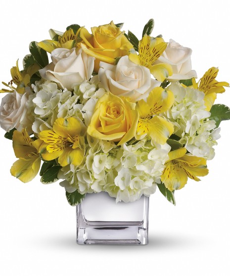 The bright bouquet includes white hydrangea, light yellow roses, white roses and yellow alstroemeria accented with fresh greenery. Delivered in transparent glass cube vase. Approximately 14" W x 13" H