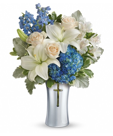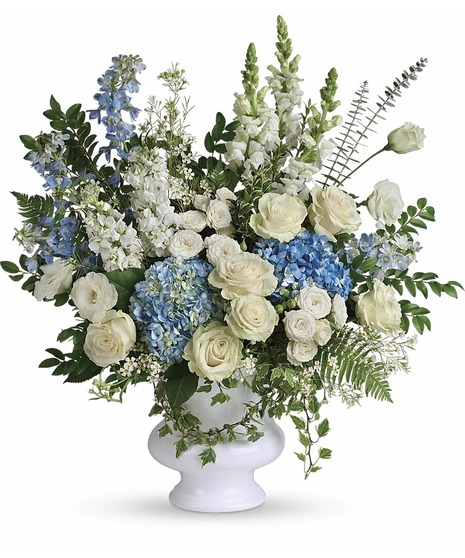 Tender Remembrance Collection includes the following four sympathy set pieces: Tender Remembrance Casket Spray, Pure Heart, Treasured And Beloved Bouquet DX, and Skies Of Remembrance Bouquet DX.
