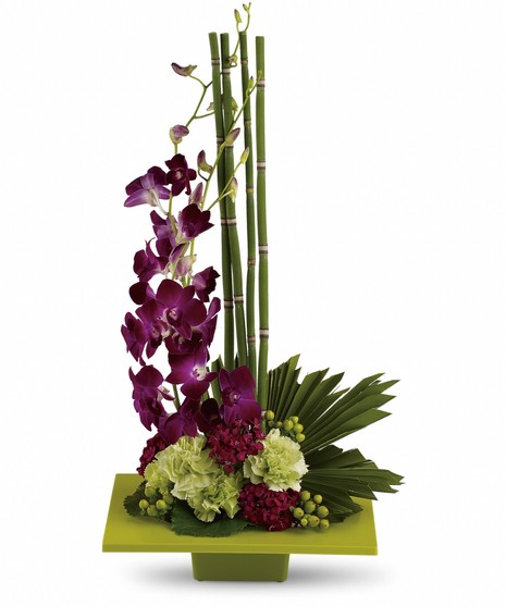 Purple dendrobium orchids, green carnations, dark pink Sweet William, an emerald palm leaf and other tropical greens are arranged in a square container. Perfect when you've got a yen to send Zen! Approximately 15" W x 25" H