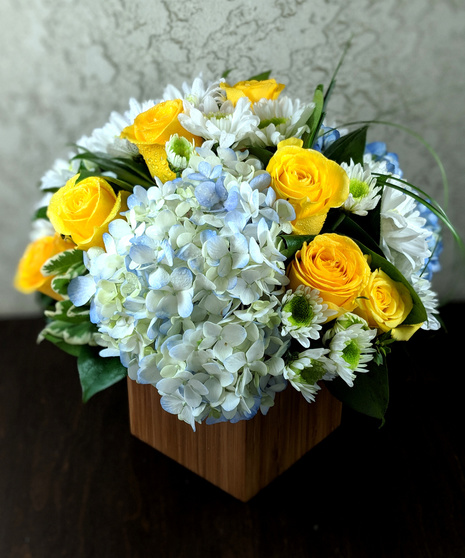 Give your senses a break from the same old, same old with soft blue hydrangea in a lush arrangement of yellow blooms beautifully arranged in a chic bamboo cube. It's a great way to leave home without leaving home.