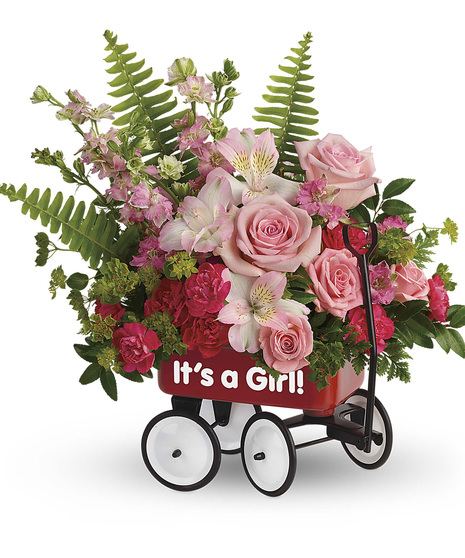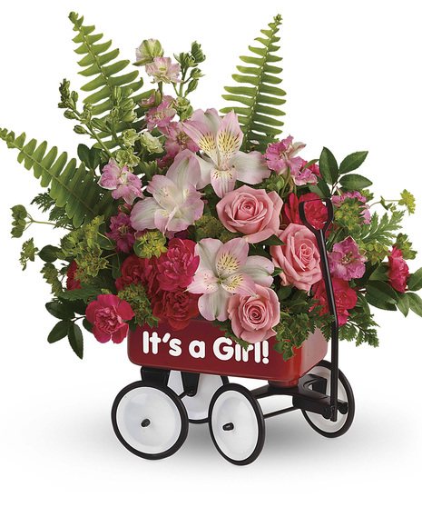 Give your welcome some wheels! A childhood classic, this cute red wagon is a whimsical way to send the new family a bright pink bouquet of roses, alstroemeria, and carnations.