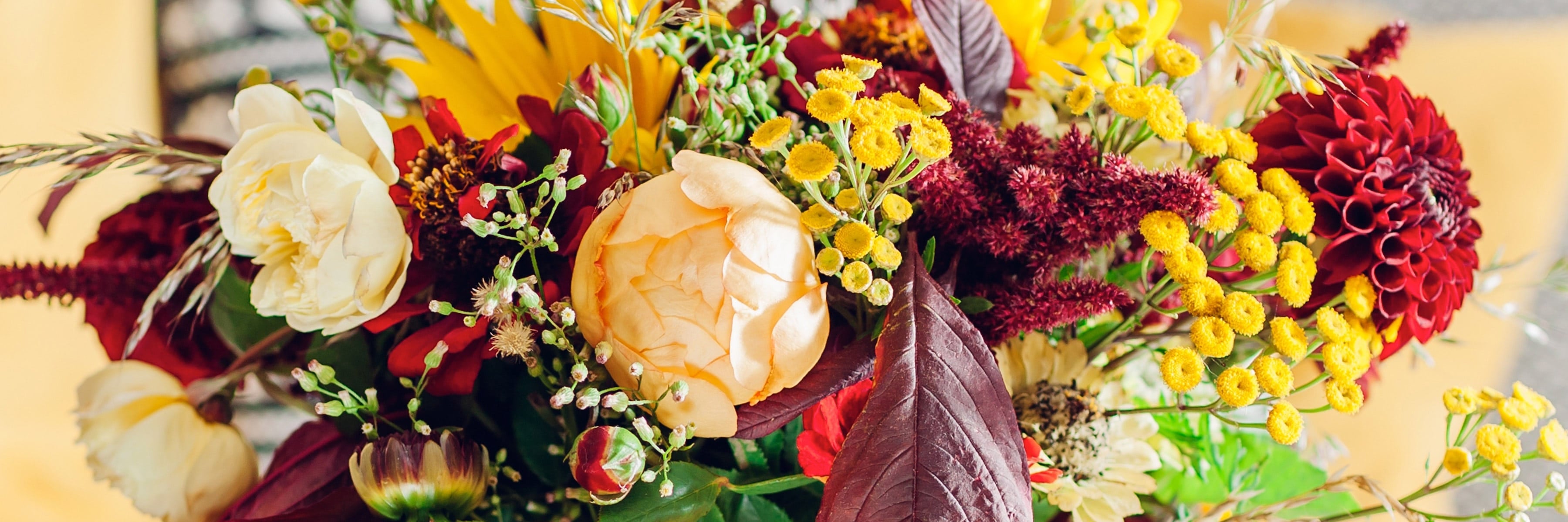 Deep earth tones help us feel grounded during this season of transition, like a warm hug from nature as everything starts to slow down. Jewel-toned blooms, especially roses, dahlias, and chrysanthemums, shine in autumn, bringing depth, drama, and cozy elegance. Think velvety burgundy, golden amber, plum, rust, and other hues that echo fallen leaves, candlelight, and the feeling of snuggling in a cozy reading nook with a good book.
