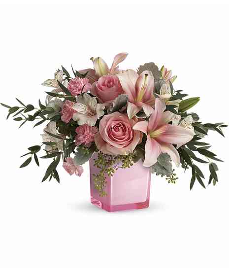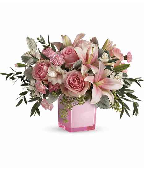 Nestled within a chic pink cube vase, this arrangement is not just a collection of flowers; it's a statement of grace and sophistication. The "Fabulous Flora" bouquet is perfect for adding a touch of floral splendor to any space or as a thoughtful gift to convey sentiments of joy and admiration.