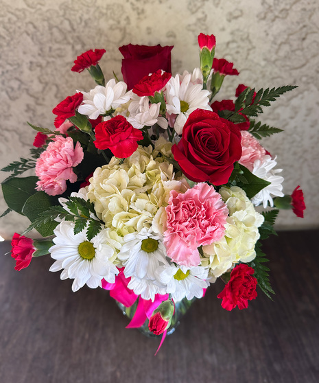 The Heartstring Medley is a heartfelt floral arrangement designed to express warmth, love, and gentle elegance. Featuring rich red roses, soft white hydrangea, white chrysanthemum daisies, pink carnations, and red mini-carnations, this arrangement creates a beautifully balanced mix of color and texture. Designed in a clear glass vase and finished with a coordinating satin bow, it’s a meaningful choice for birthdays, anniversaries, get-well wishes, or simply letting someone know you care. Available for same-day flower delivery to Rowland Heights, Whittier, Glendora, CA, and surrounding cities.